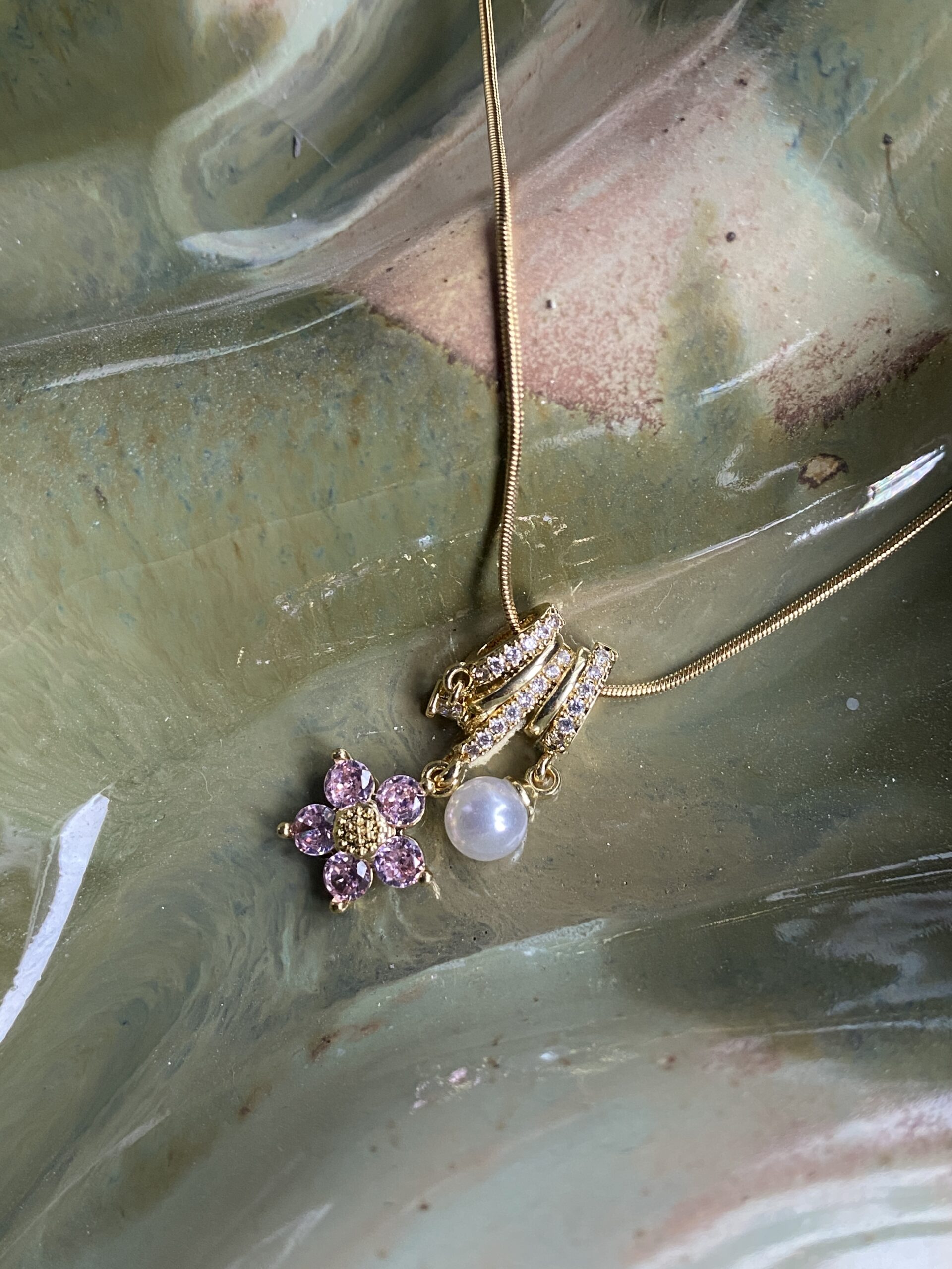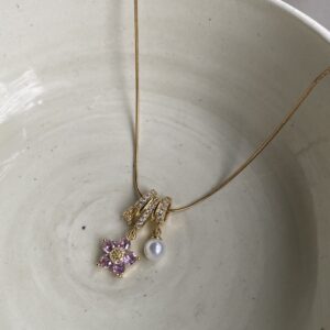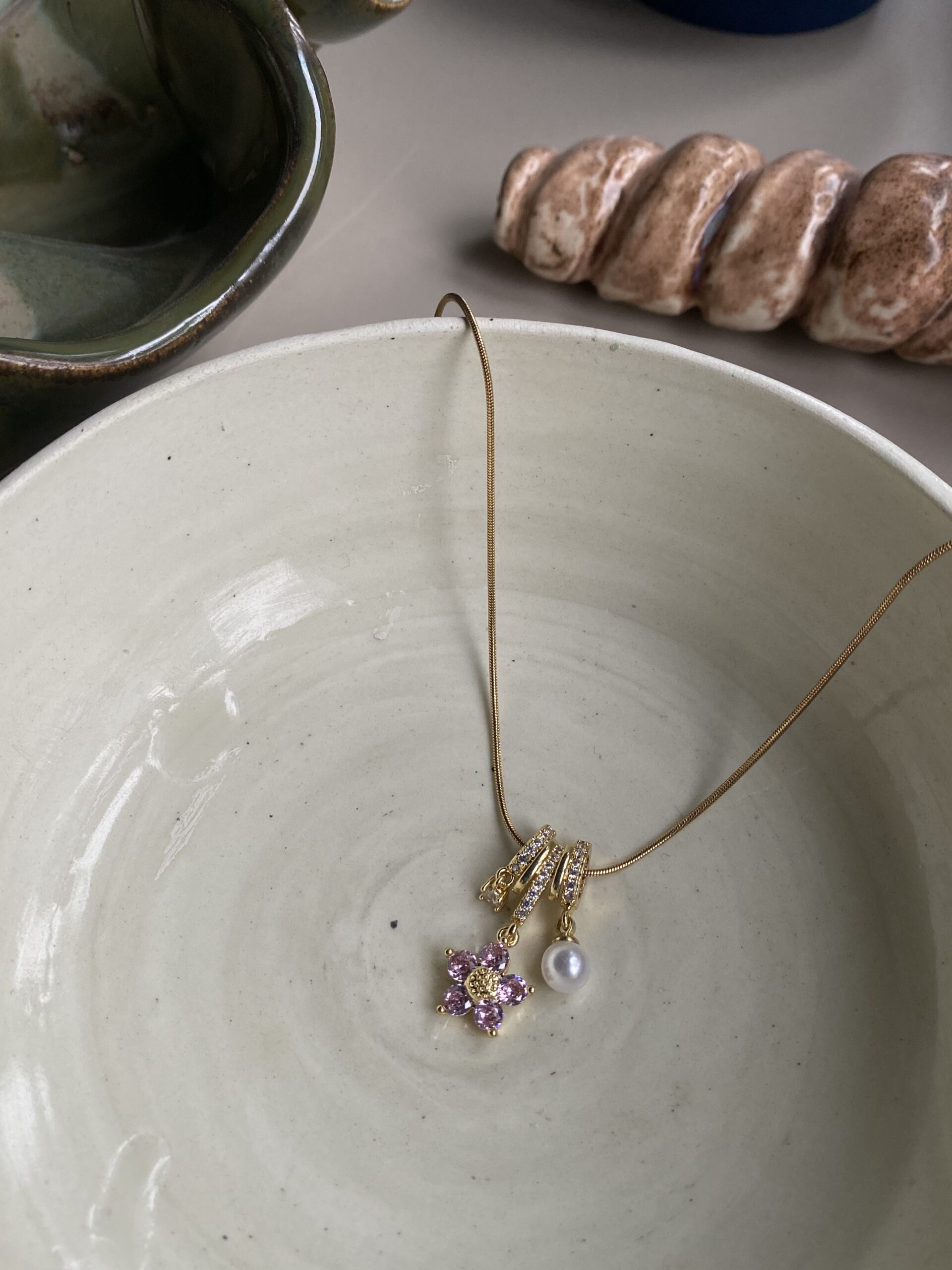 A sweet pop of pink sparkle and a little pearl charm on a golden chain—fresh, fun, and effortlessly chic.