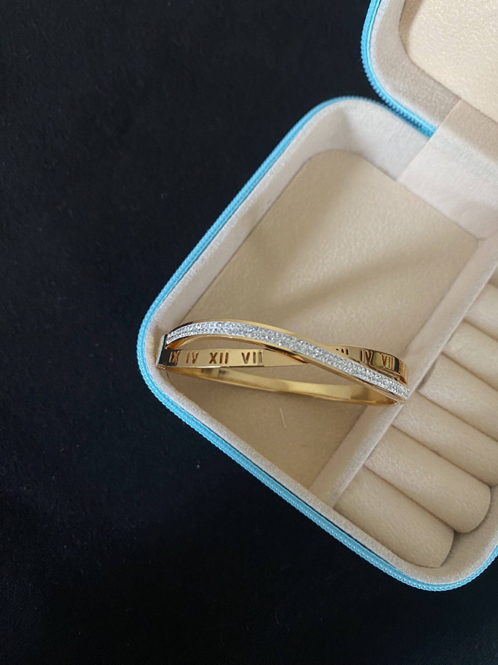 Usual in size. Two layered- Rinestones and gold plated Roman numbers bracelet.